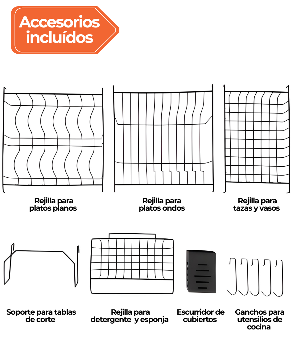 - ✔️ Accesorios: Ganchos, porta utensilios, bandeja, soportes