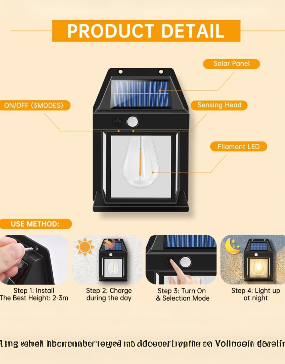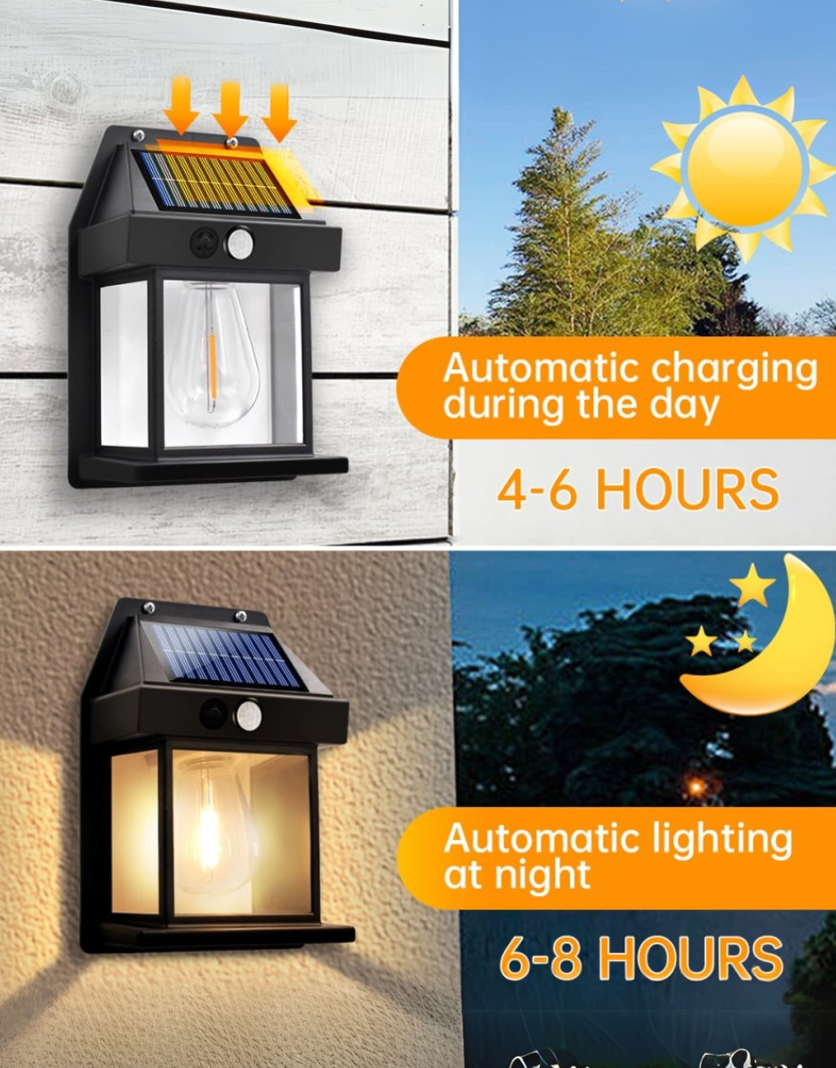 Esta Lámpara Solar de Pared decora con un estilo moderno y elegante. Funciona con energía solar, se enciende sola al anochecer y es resistente al clima. Ideal para patios, pasillos, terrazas, balcones y muros exteriores.